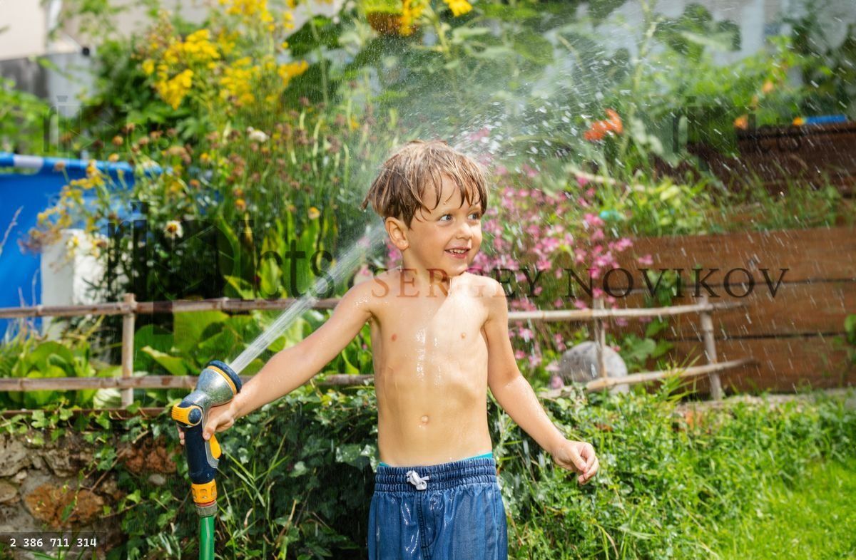 緑豊かな庭でスプレーノズルから水をまき散らして笑う、喜んだ少年