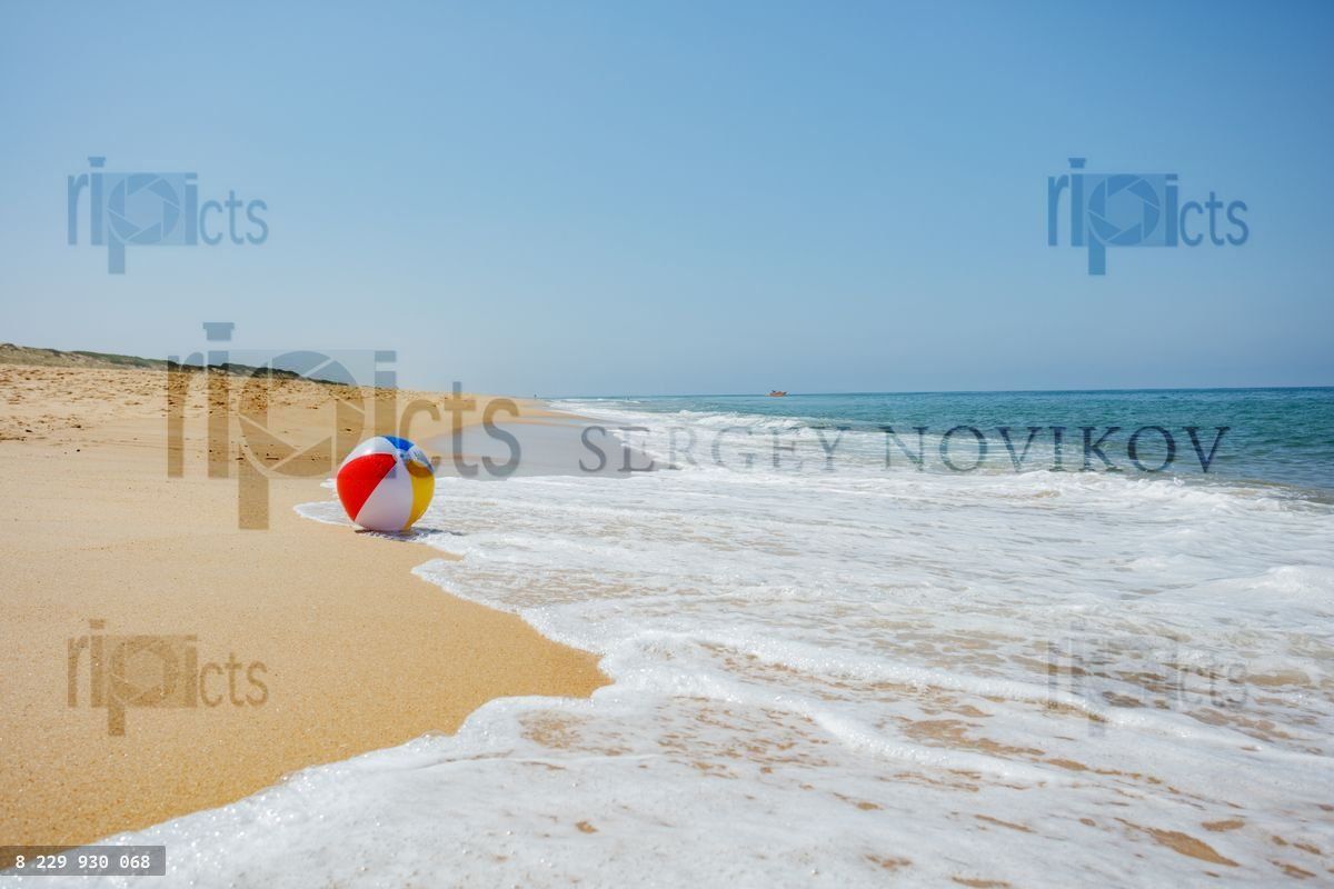 穏やかな波が打ち寄せる砂浜にあるカラフルなビーチボール、夏の休暇のコンセプト