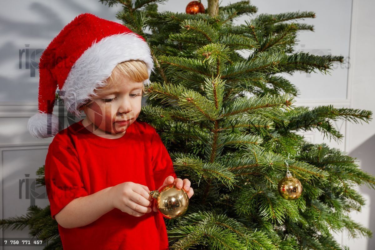 A young child wearing a Santa hat is decorating a Christmas tree with a gold ornament ball full of xmas spiritLoading purchase options...