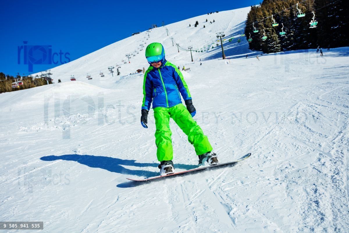 Action photo of a snowboarder boy in motion on ski slope