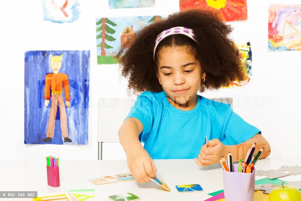 Cute African girl playing developmental game putting cards matching relations on table while sitting in playroom with wall behind full of children drawingsLoading purchase options...