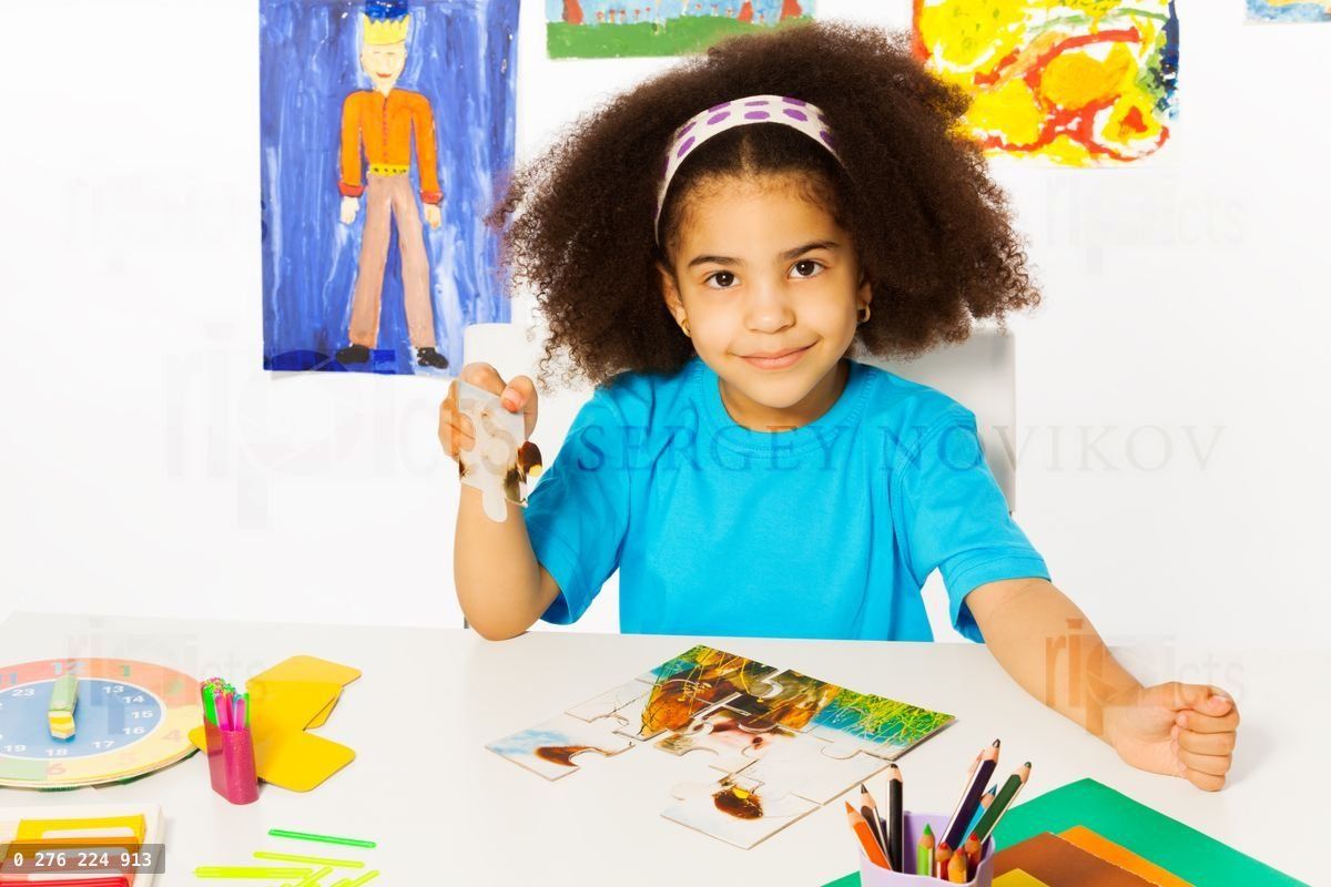 African girl puts puzzle pieces together at the table while sitting in playroom with wall behind full of children drawingsLoading purchase options...