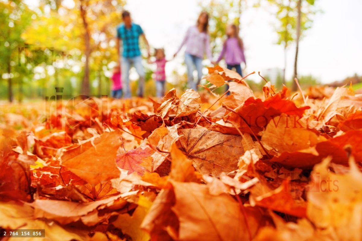 Autumn orange leaves close up and out of focus family walks on the background walking holding handsLoading purchase options...
