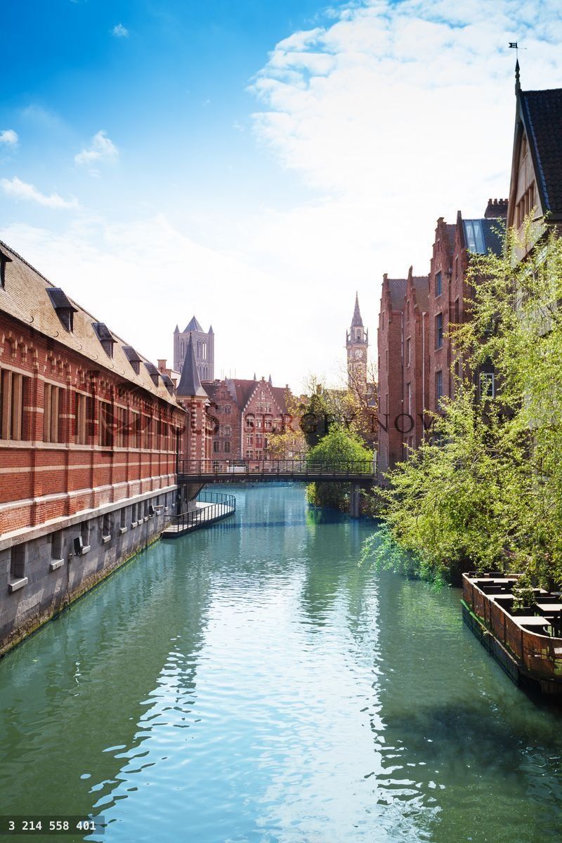 Beautiful view of bridge over river and houses of bricks color in Ghent, Flemish region of BelgiumLoading purchase options...