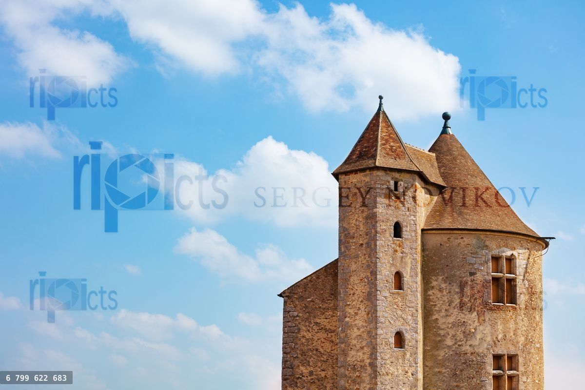 Beautiful medieval castle square tower roof over blue sky, Blandy-les-Tours, FranceLoading purchase options...