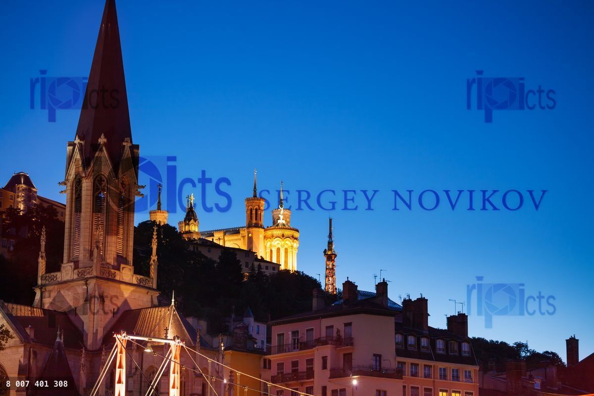 Night Lyon skyline with illuminated St. Georges church and Basilica of Notre-Dame de Fourviere in the backgroundLoading purchase options...