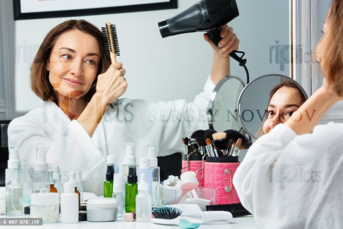Beautiful middle aged woman in housecoat holding hairdryer dry hair before makeup mirrorLoading purchase options...