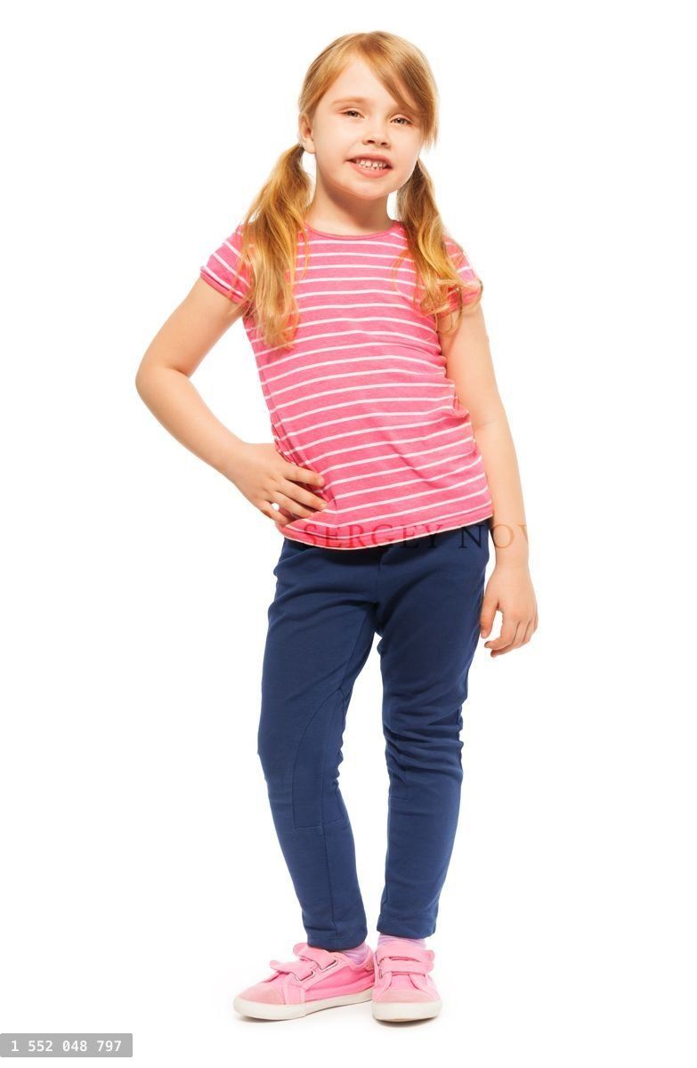 Full-length picture of beautiful seven years old girl in tee and leggings, posing at the camera, isolated on whiteLoading purchase options...