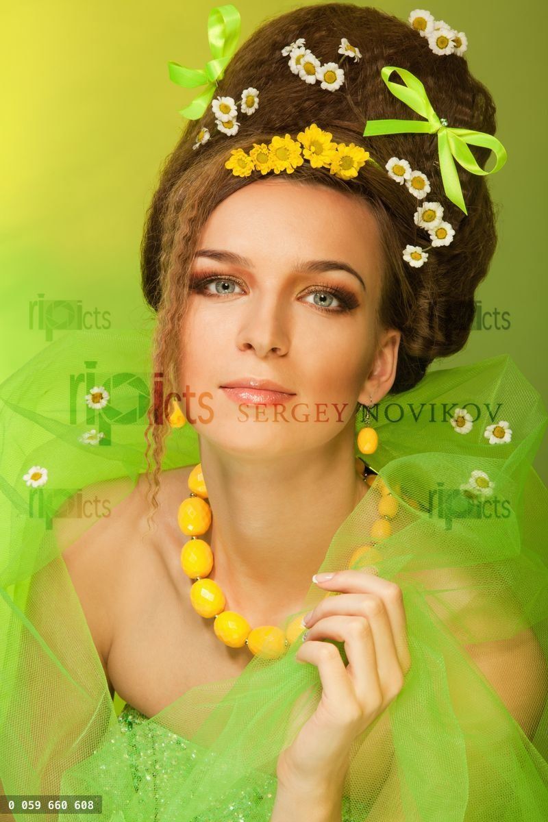 Long waited spring - beauty portrait attractive woman with bows and flowers in her hair and dress, with professional hairstyle and make upLoading purchase options...
