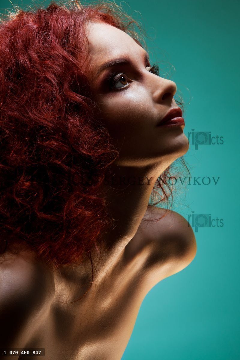 Beauty portrait of woman with red curly hair on blueLoading purchase options...