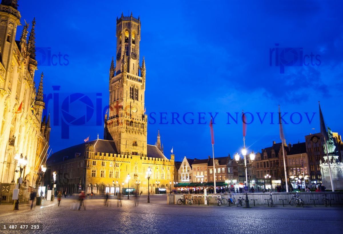 Belfry of Bruges and Grote Markt at night illuminated with lights in beautiful Bruges, BelgiumLoading purchase options...
