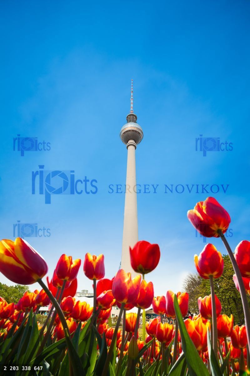Berliner Fernsehturm view from below with red tulips in Berlin, GermanyLoading purchase options...