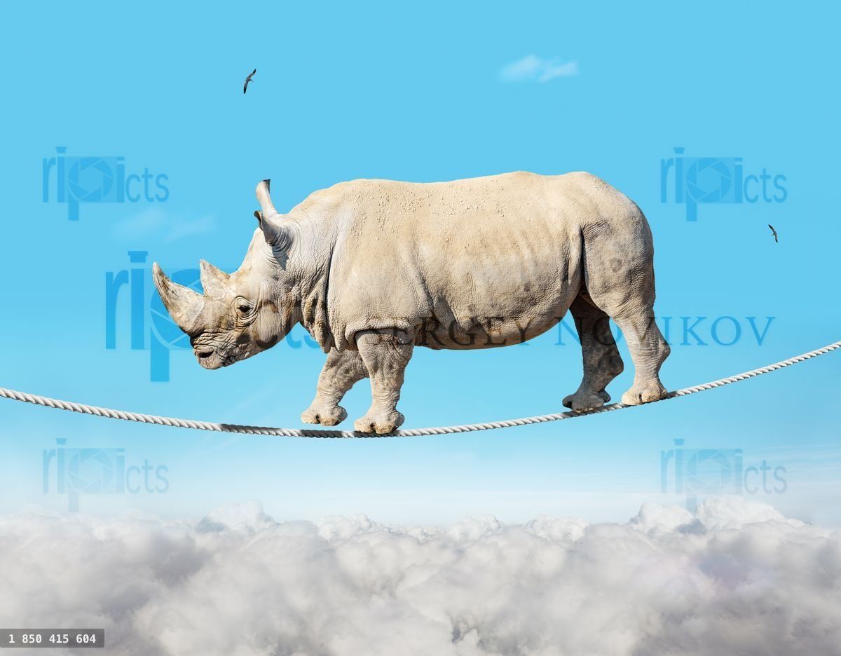 Heavy big bulky tightrope walker rhinoceros walk on the rope in the sky over clouds - concept imageLoading purchase options...