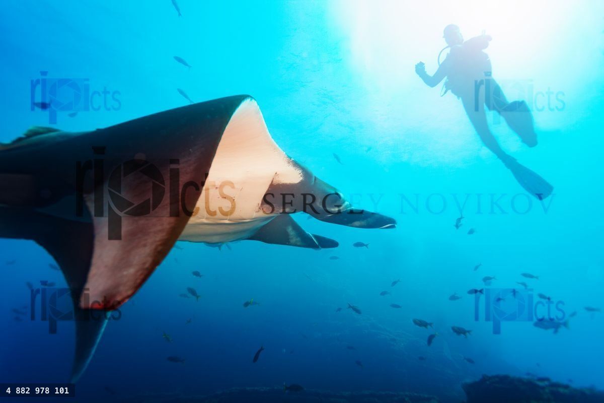 Side photo of beautiful Manta ray in the sunlight swimming near diverLoading purchase options...