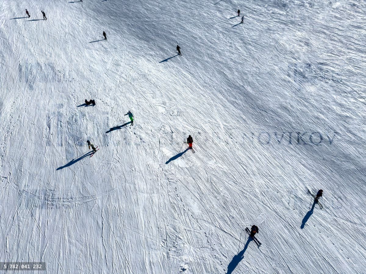 A high-angle shot reveals skiers as colorful dots on fresh white snow, their elongated shadows trailing behind them on the bright winter slopeLoading purchase options...