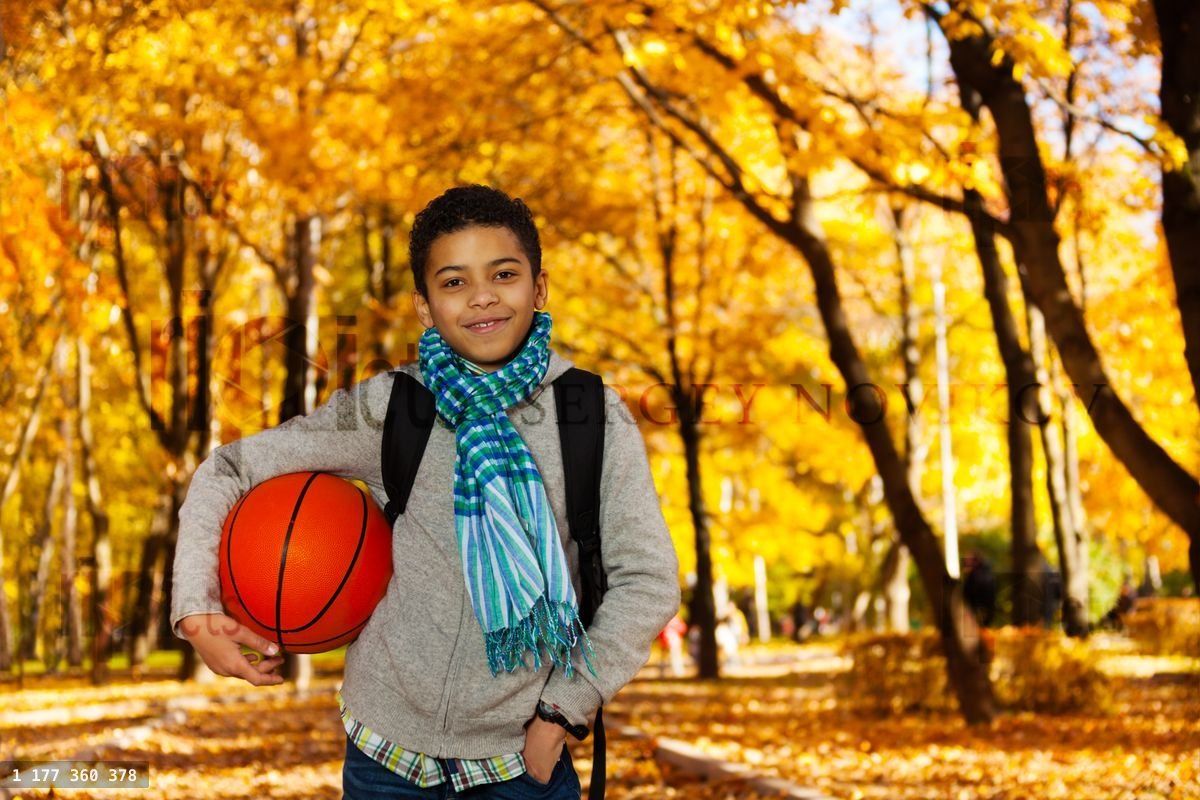Handsome black boy 10 years old standing in the autumn park under maple trees with orange basketball ball wearing casual clothes with scarf and sweatshirtLoading purchase options...