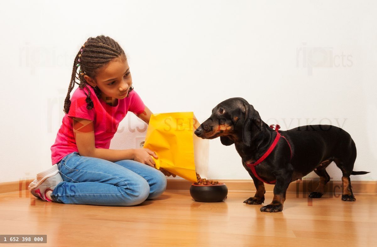 Nice black girl feed dachshund dog putting feed from package to plate on the floor at homeLoading purchase options...