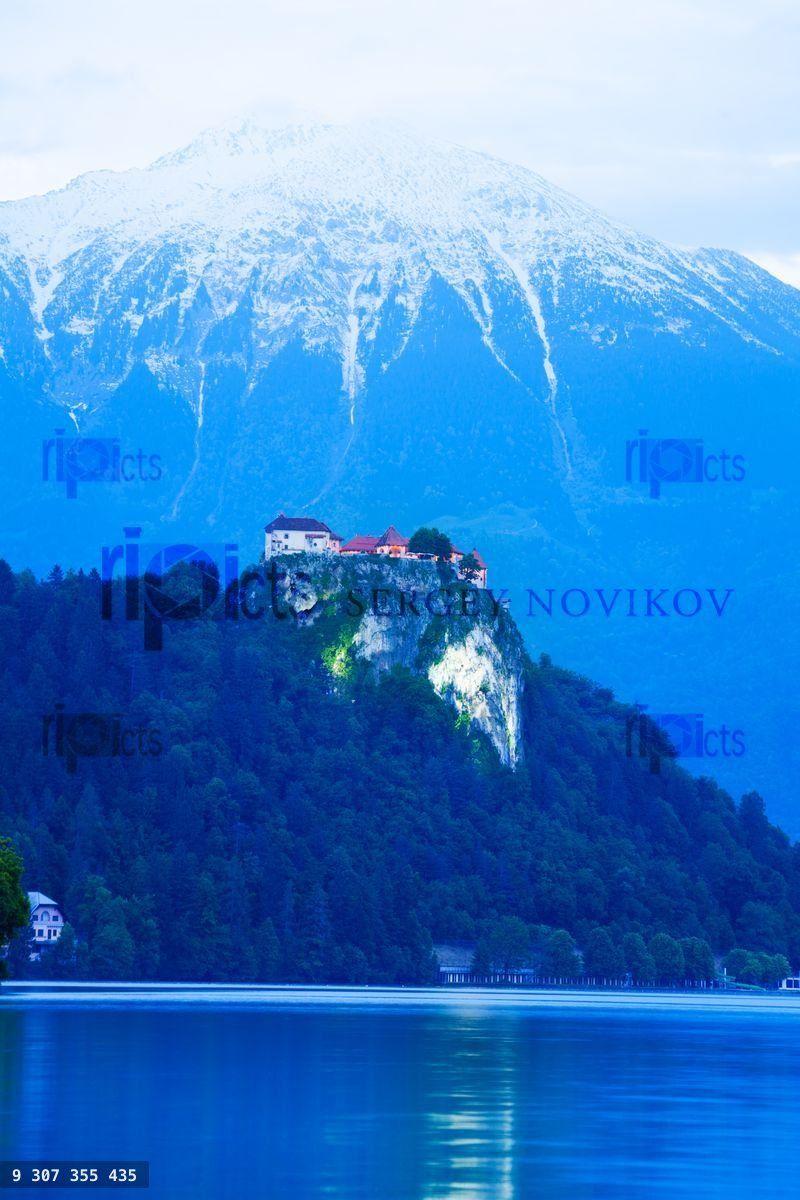 Bled castle cliff and lake at night dusk, SloveniaLoading purchase options...