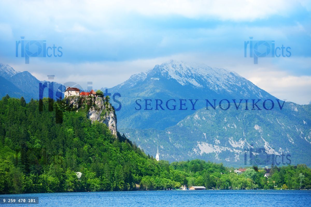 Bled castle cliff with mountains on background, main attraction in SloveniaLoading purchase options...