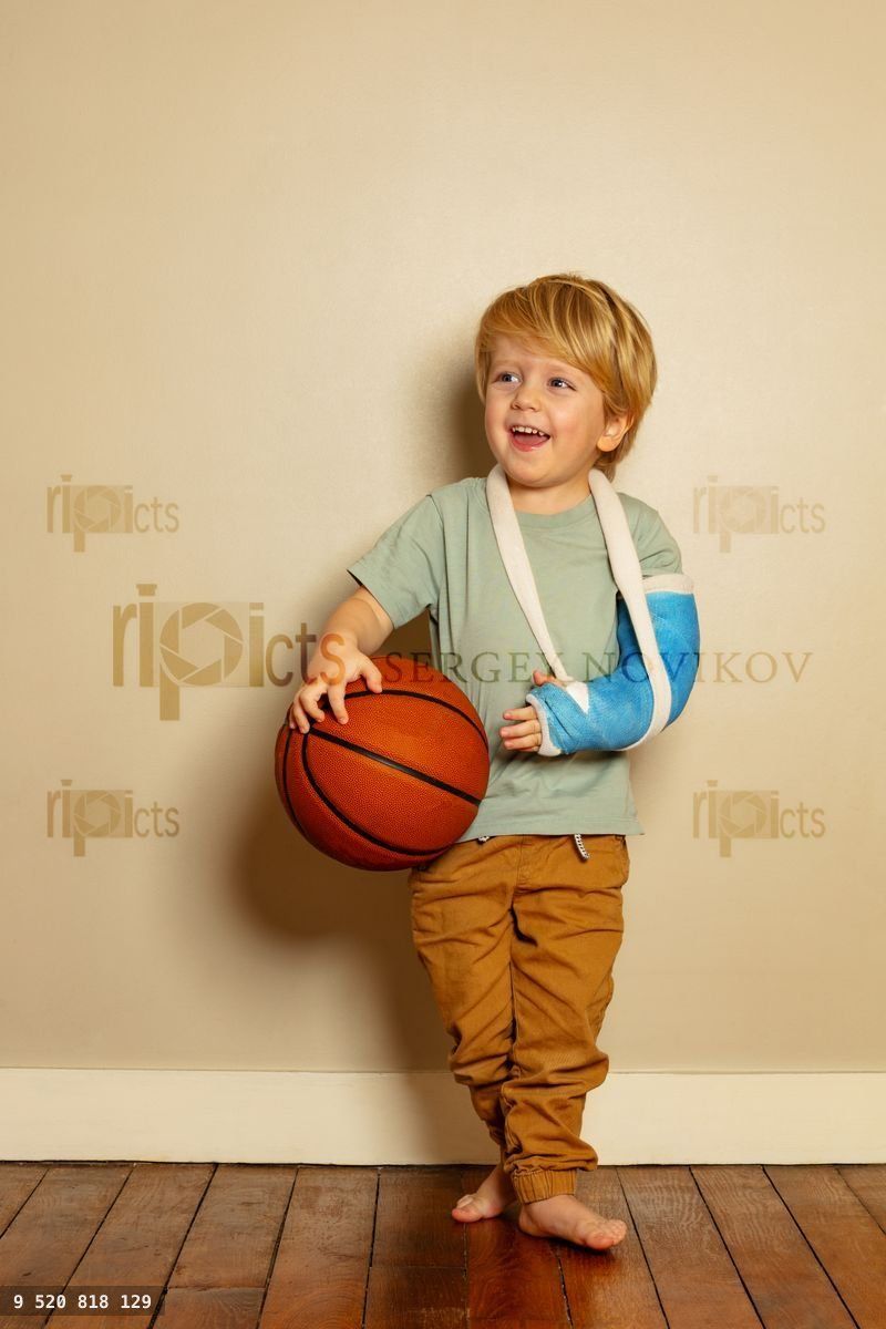 Portrait of a blond boy hold big orange basketball ball in hands with broken hand in blue plaster castLoading purchase options...