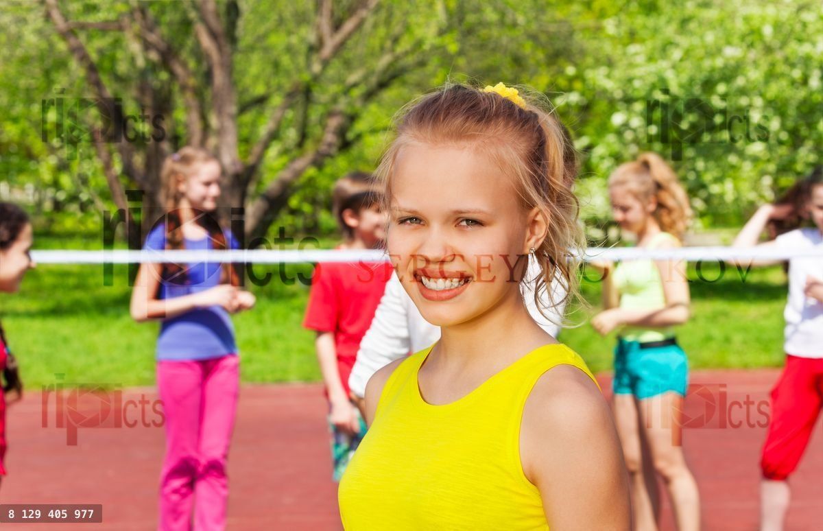 Blond beautiful teen girl and friends playing behind in volleyball on the playground during sunny summer dayLoading purchase options...
