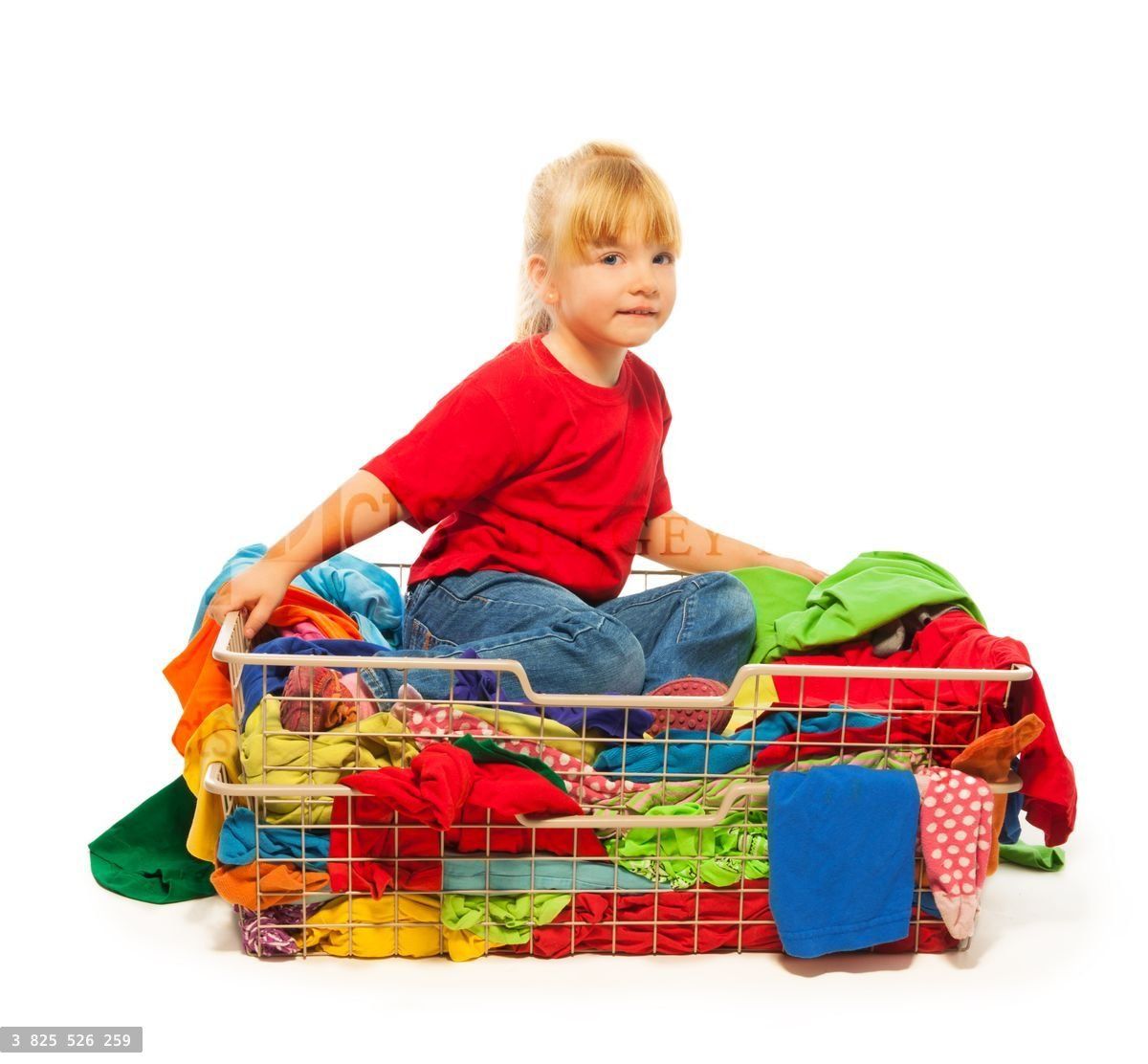 Blond girl in red shirt sitting in clothes basketLoading purchase options...