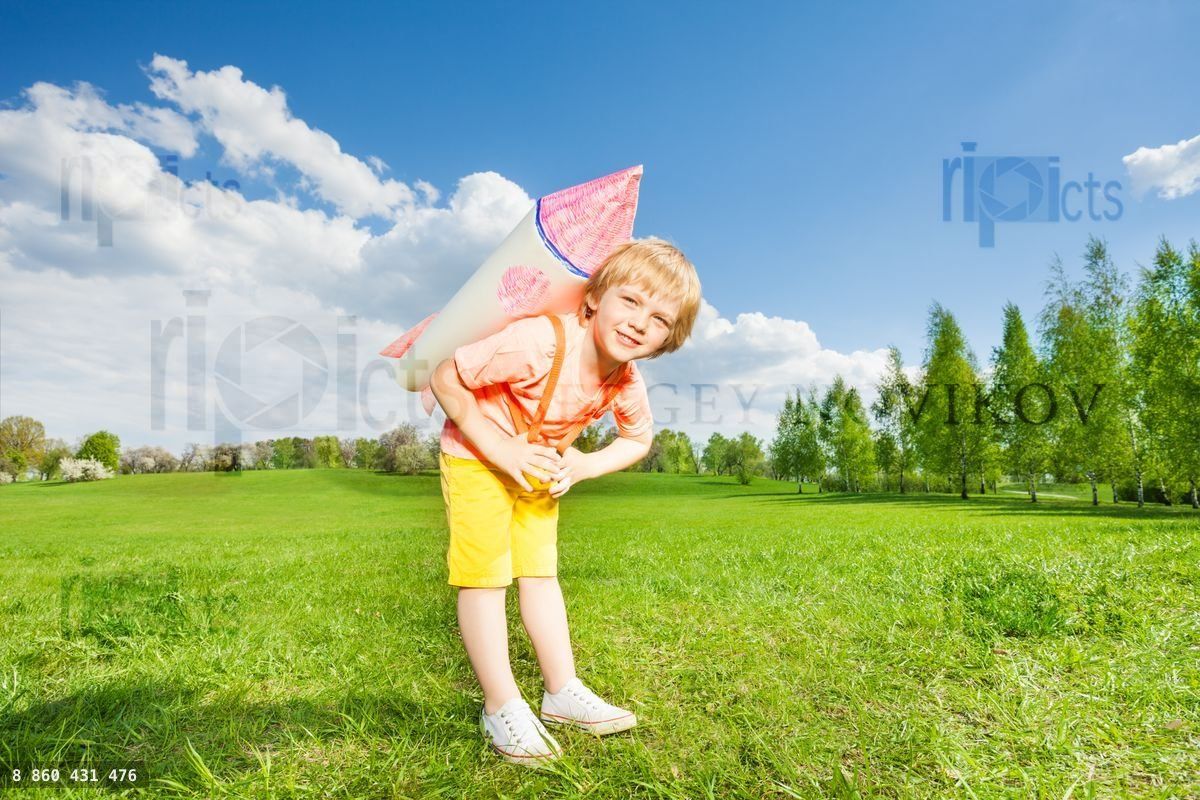 Blond small boy wears paper rocket toy on his shoulders during sunny day in the green fieldLoading purchase options...