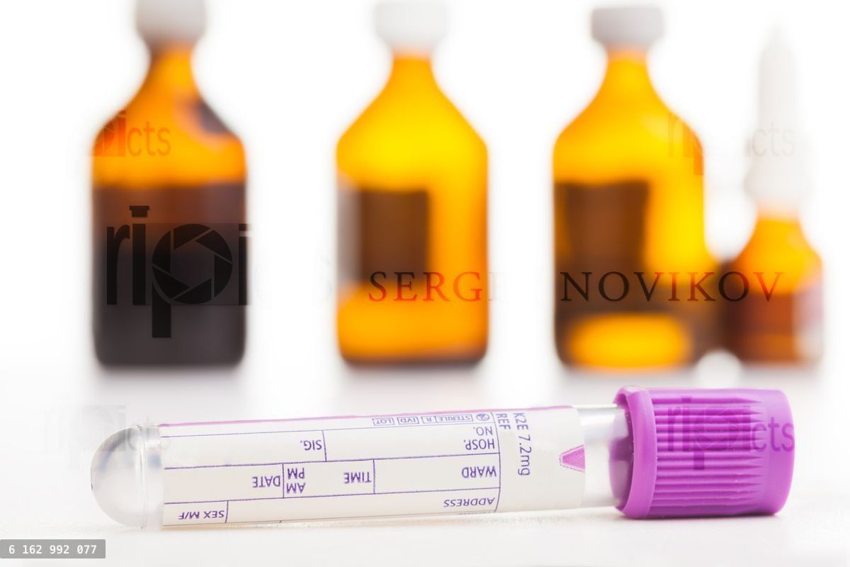 Blood sample tube and jars with mixture and other medicine in bottles on backgroundLoading purchase options...