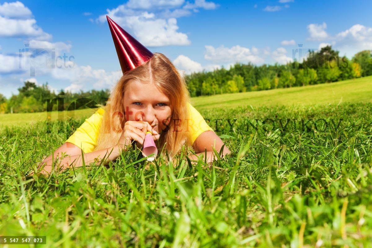 Beautiful teen girl with noisemaker horn and birthday party cap laying outside with happy expression on sunny summer dayLoading purchase options...