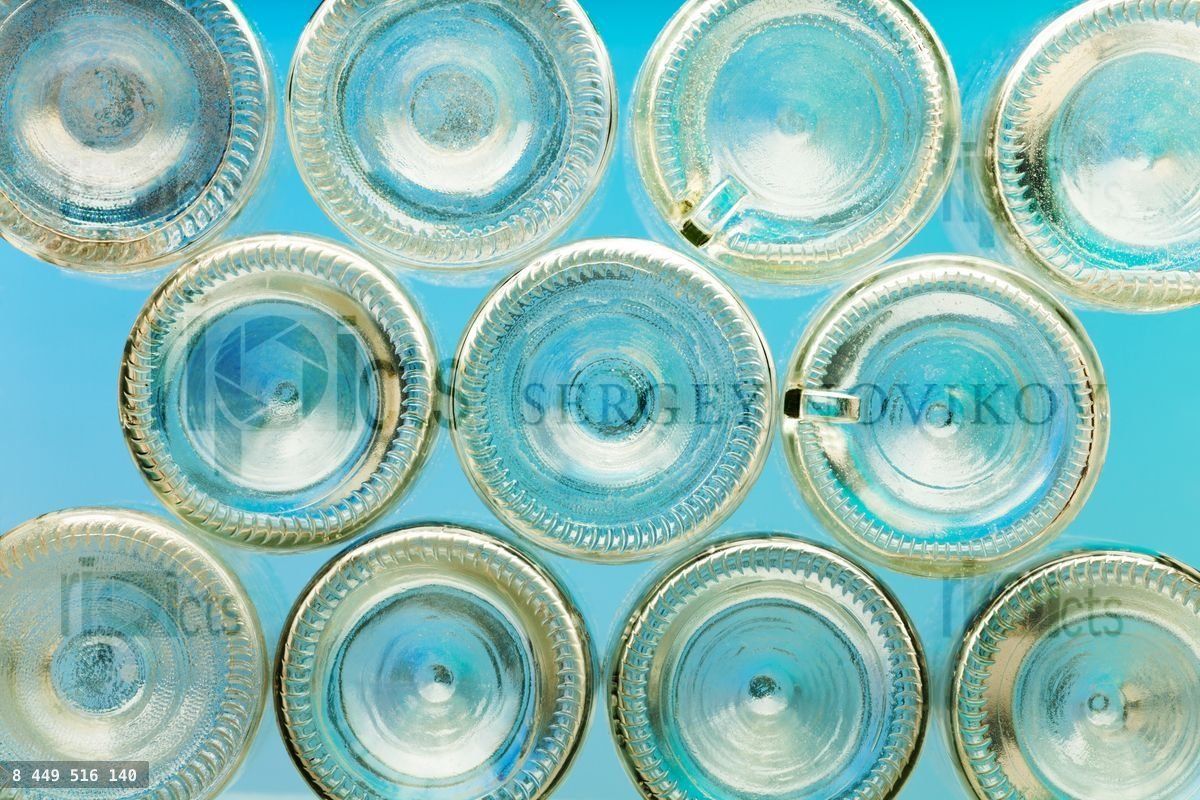Row of bottoms of empty glass bottles on blue backgroundLoading purchase options...