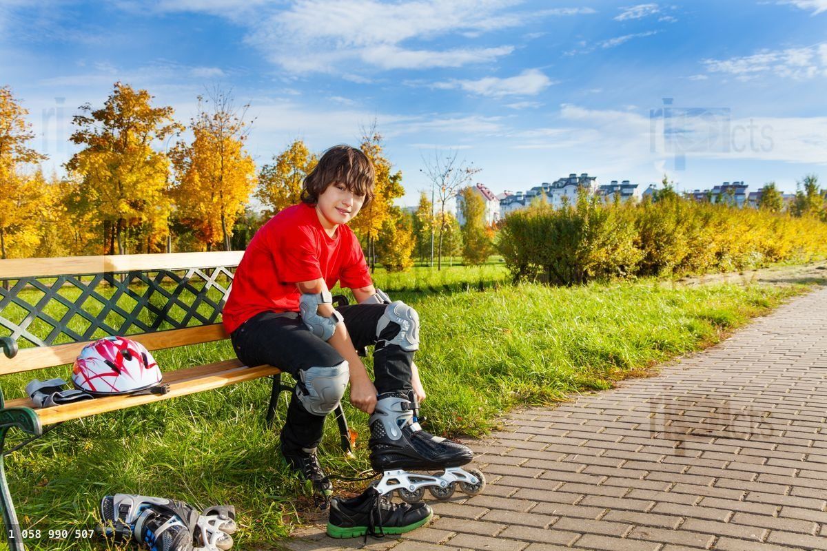 Boy getting ready to skating putting on rollerblades sitting on the bench in the parkLoading purchase options...