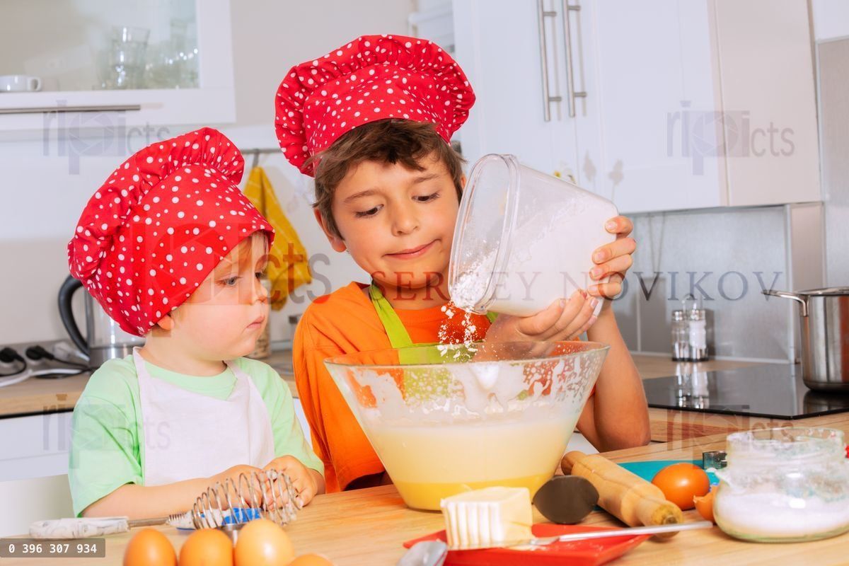 Boy with little brother pour out flour to the mixing bowl preparing dough cooking cookies at home wearing chef hatsLoading purchase options...