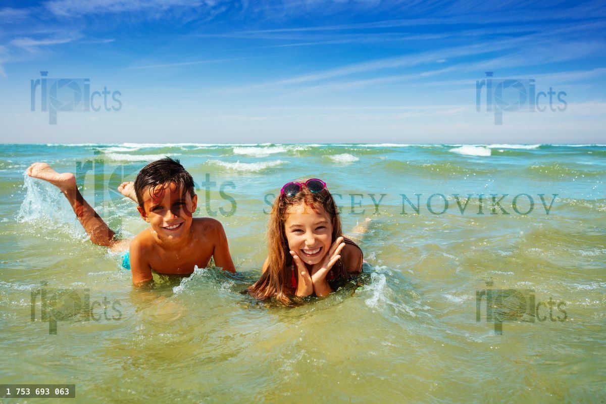 Two happy little kids boy and girl lay on the belly in the sea waves enjoying summer vacationsLoading purchase options...