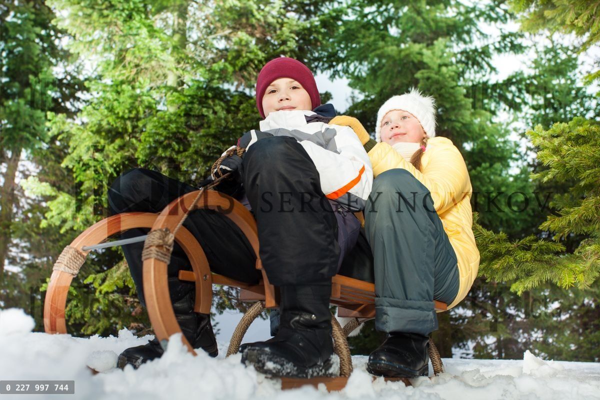 Boy and girl slide down a hill on wooden sledge