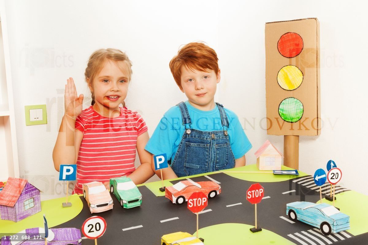 Caucasiangirlboykidkidschildrenhappinesssmilehappyschoolgirlschoolboypreschoolerfivesevenyearsfunsafetysigntrafficroadrulescodelawcarefulsignalredplaygamepretendpersonlightlight-signallessonschoolkindergartenmodelcardboardpapercarparkingcrosswalkplayingroomfieldhandupstreetdrivinglearningroad safety class