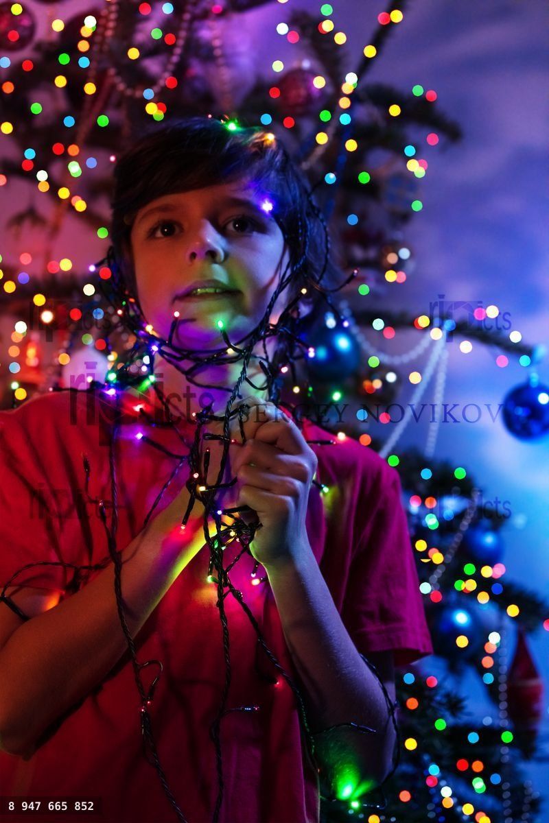 Boy with illuminated garland lights on and subtle smile stand near decorated Christmas treeLoading purchase options...