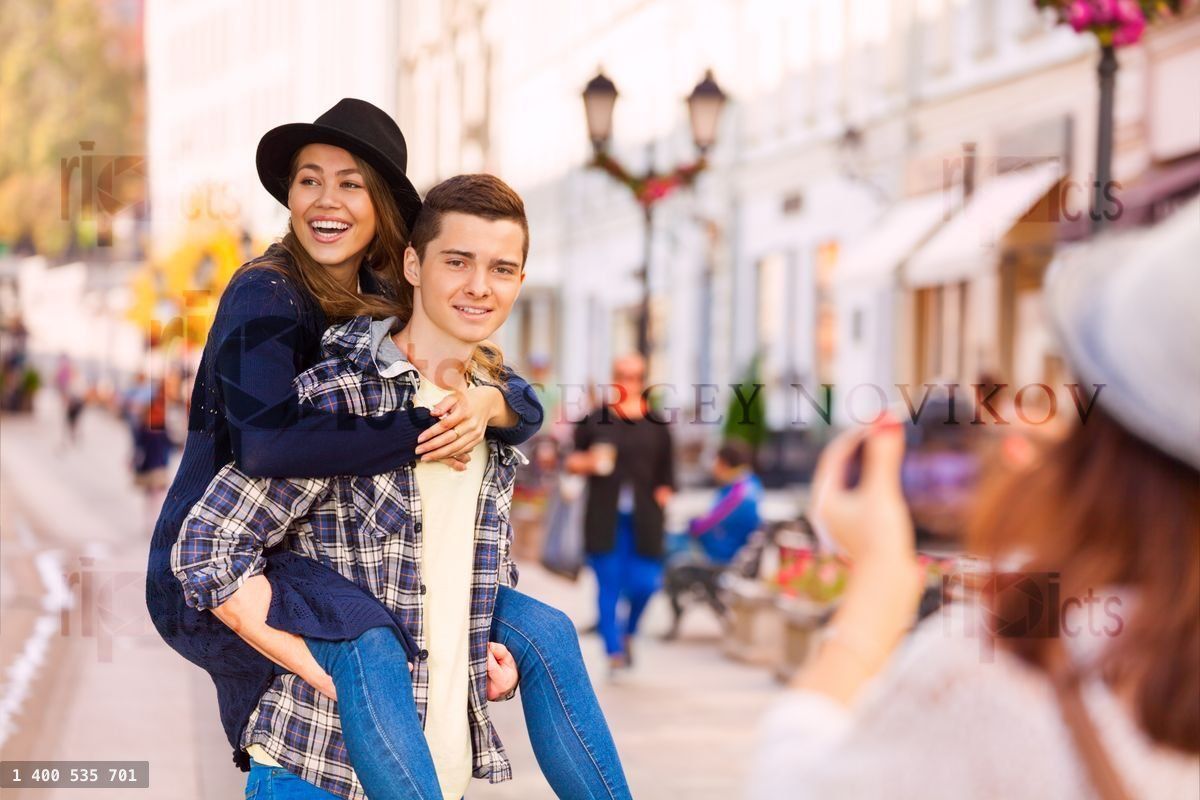 Boy carrying laughing woman and girl shooting them with professional camera on the European street during summer day timeLoading purchase options...