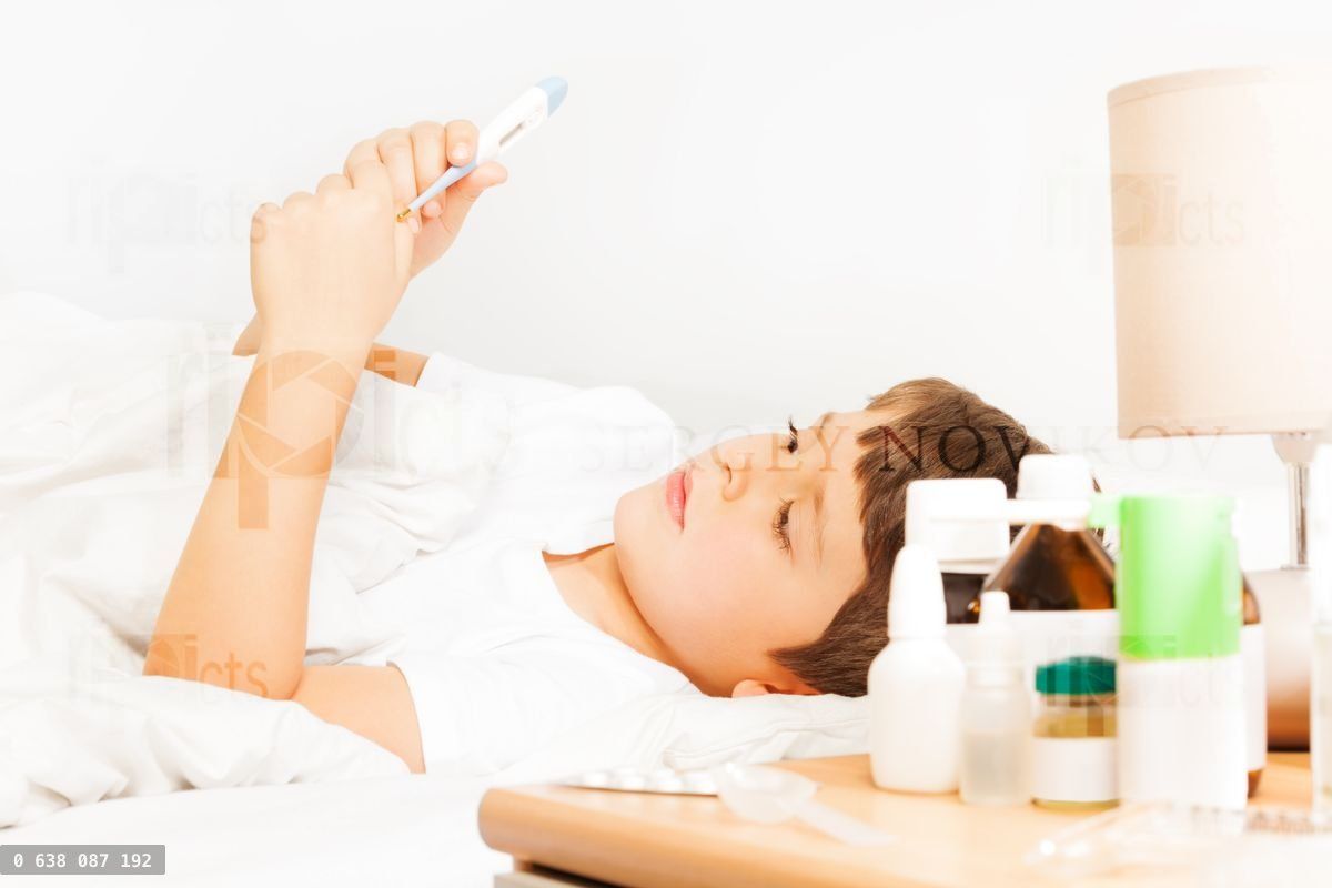 CaucasiankidchildboysickillhealthcareclinichospitalwardbedroomhomelayingcoldchillcatarrhmedsmedicationmedicineremedydrugcuremedicamenttherapeutictemperaturefeverelectronicthermometersicknessillnessfluegrippegripvirusinfectionfluacuterespiratoryviralARVIcopy-spaceblankedtreatmentcheckingpainreliefkidslifestyle