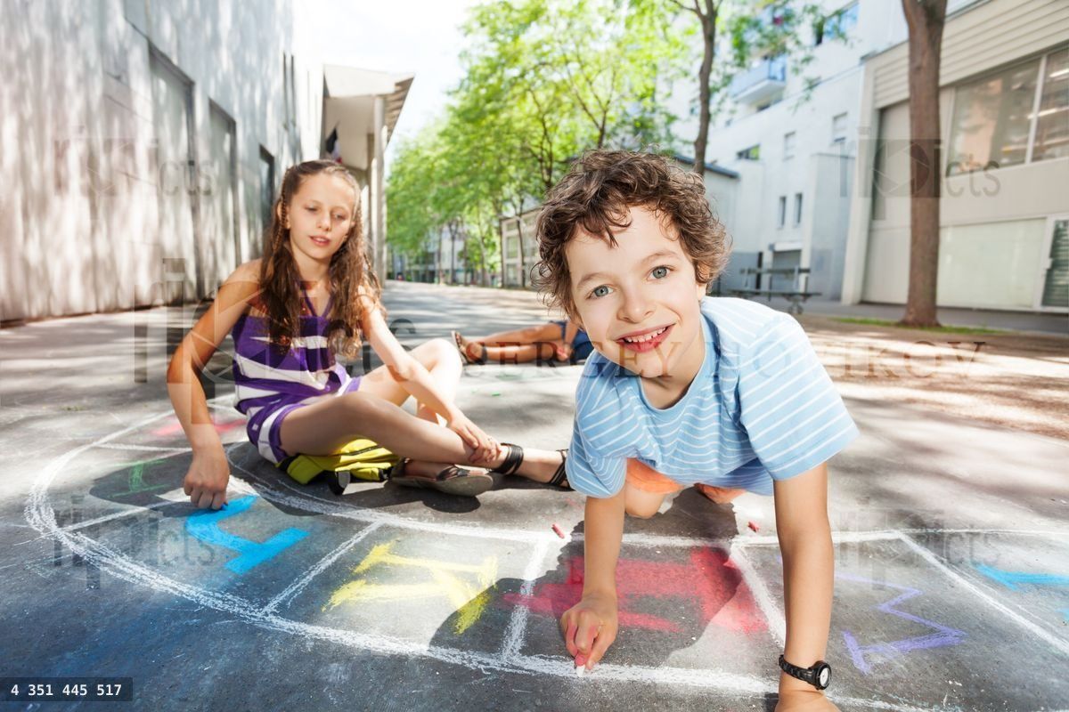 Happy boy and friends draws with chalk hopscotch game on the asphalt in the school yard smilingLoading purchase options...