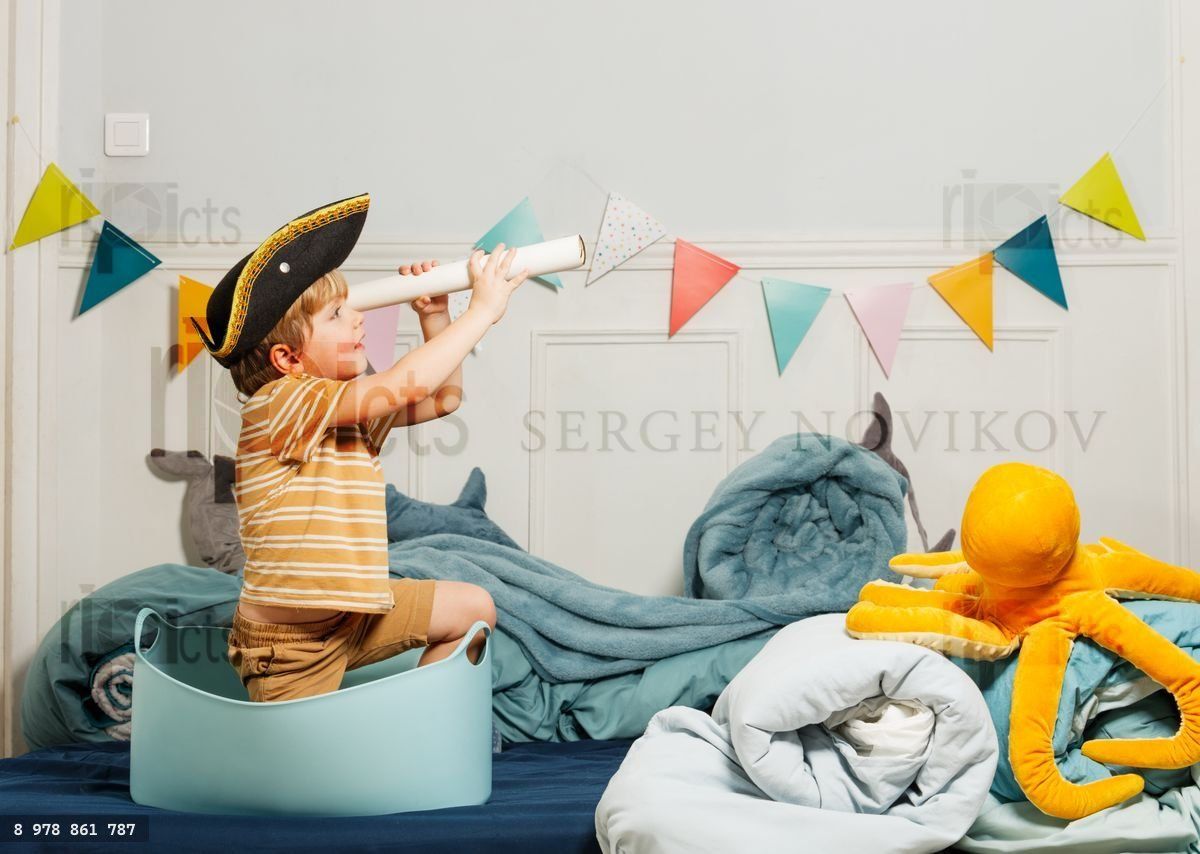 A young boy dressed in a pirate hat peers through a spyglass while sitting inside a large bin, with colorful flags hanging on the wall behind himLoading purchase options...