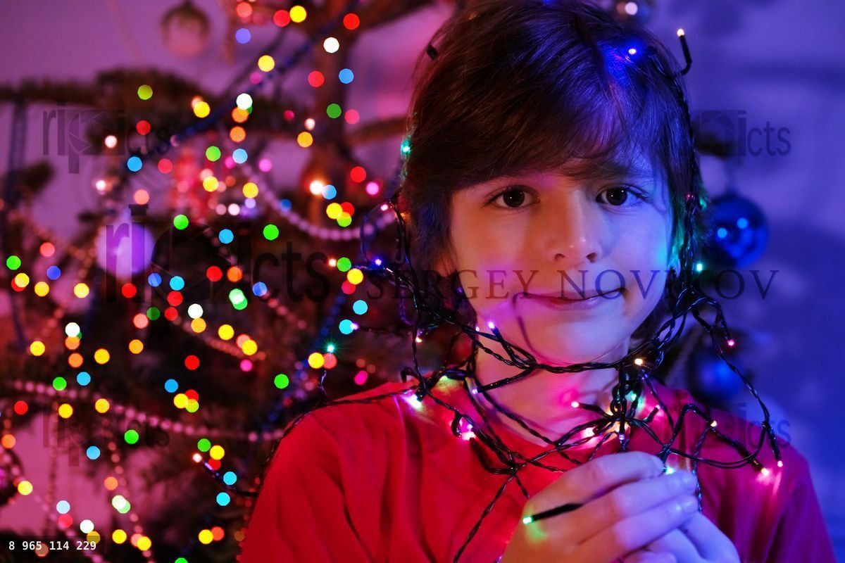 Boy face illuminated by Christmas garland lights