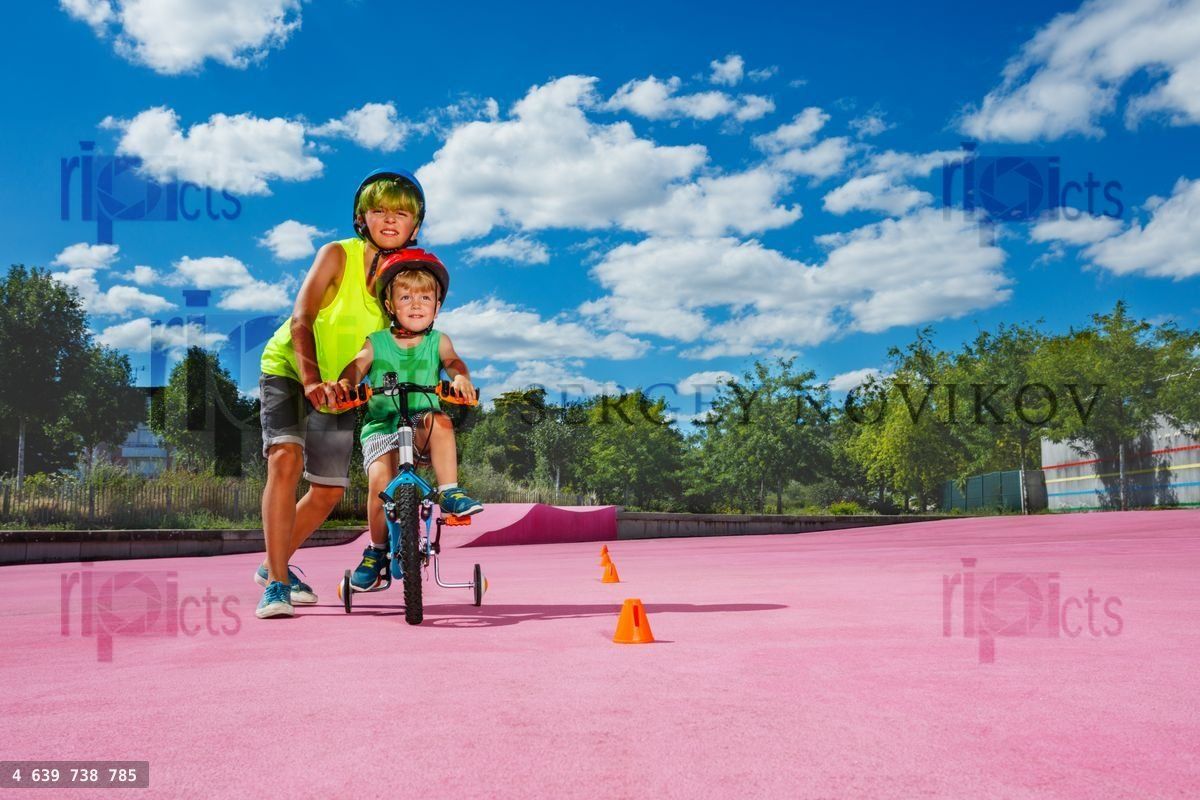 Preteen boy help little brother to learn ride a bicycle pushing the bike with hands in the park going around orange conesLoading purchase options...