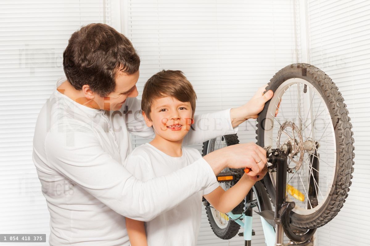 Caucasianboykidkidschildchildrenchildhoodschoolboysonmanmaledadfatherparentparentingtogetherworkrepairfixtoolimprovementfamilyhelphelperbikebicyclewheeljoblearnteachinginstrumentpliersnippershandymanequipmentgeardamagebrokenbikercyclisttransporttirediskbrakecablefixingreplacementmechanicservicemancycle