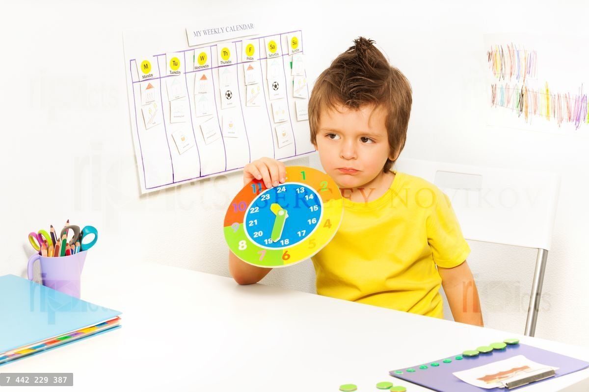 Boy holding colorful carton clock sitting at the table alone indoors with ABA calendar on the wallLoading purchase options...