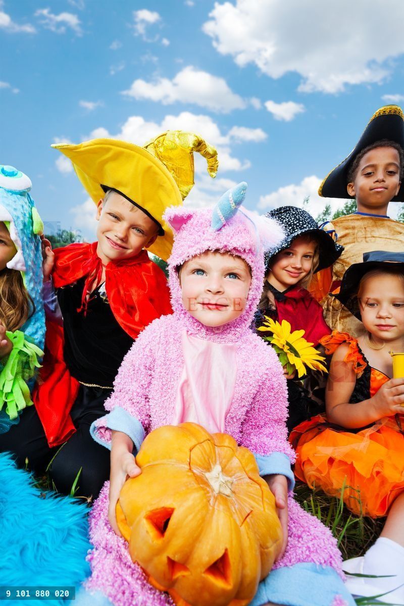 Many kids in Halloween costumes with boy holding a pumpkinLoading purchase options...