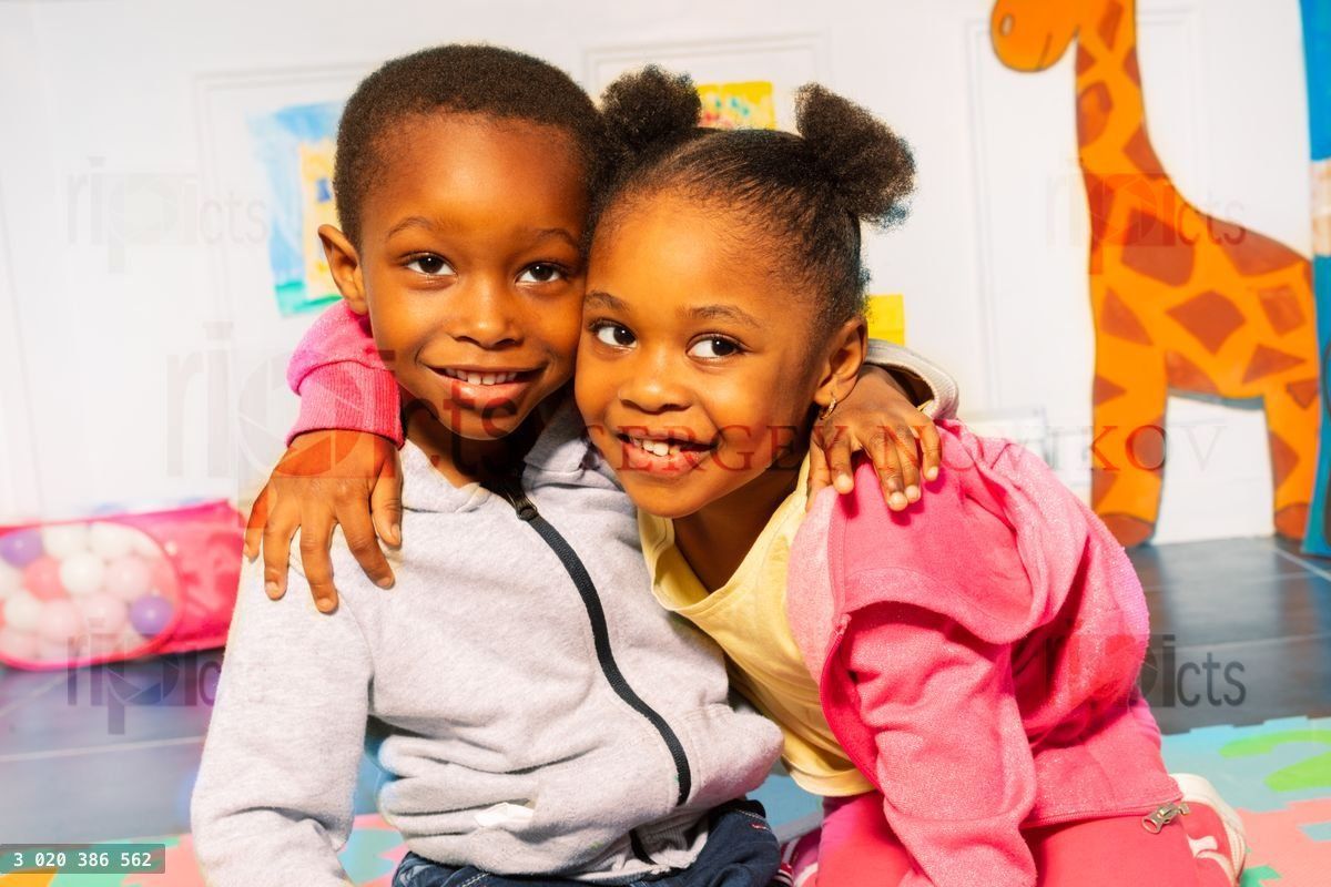 Happy boy and girl with African descend appearance in the kindergarten hug, playLoading purchase options...
