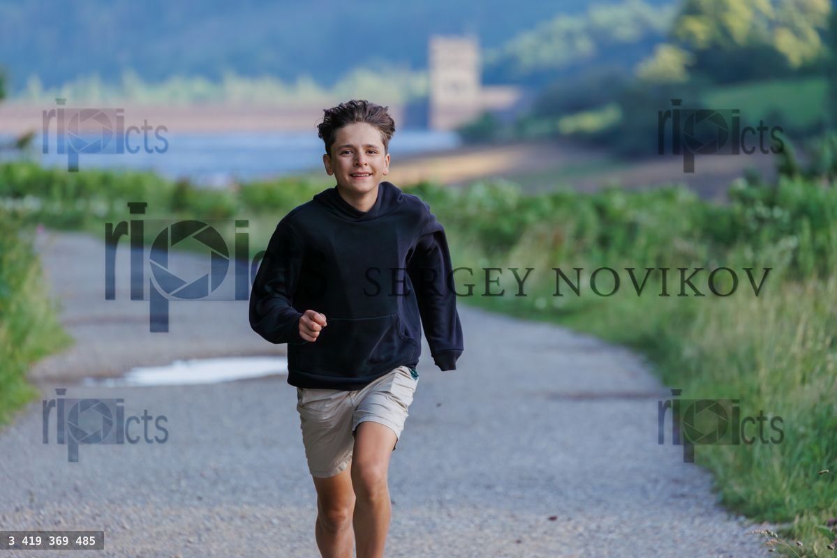 A boy is jogging on a gravel path surrounded by lush greenery, enjoying the outdoors trail along Howden reservoir, EnglandLoading purchase options...
