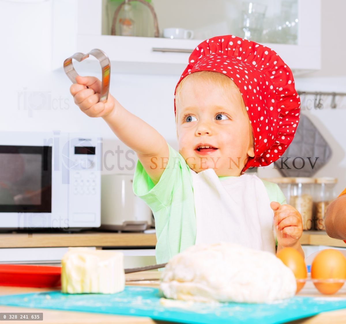 Little happy boy in chef hat show heart form for cookie baking at kitchenLoading purchase options...