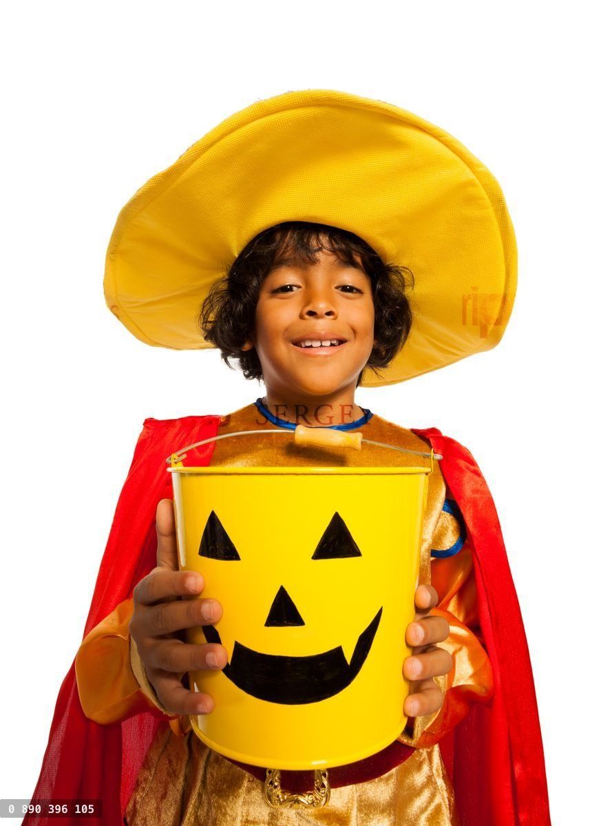 Boy in costume with Halloween spooky candy bucket
