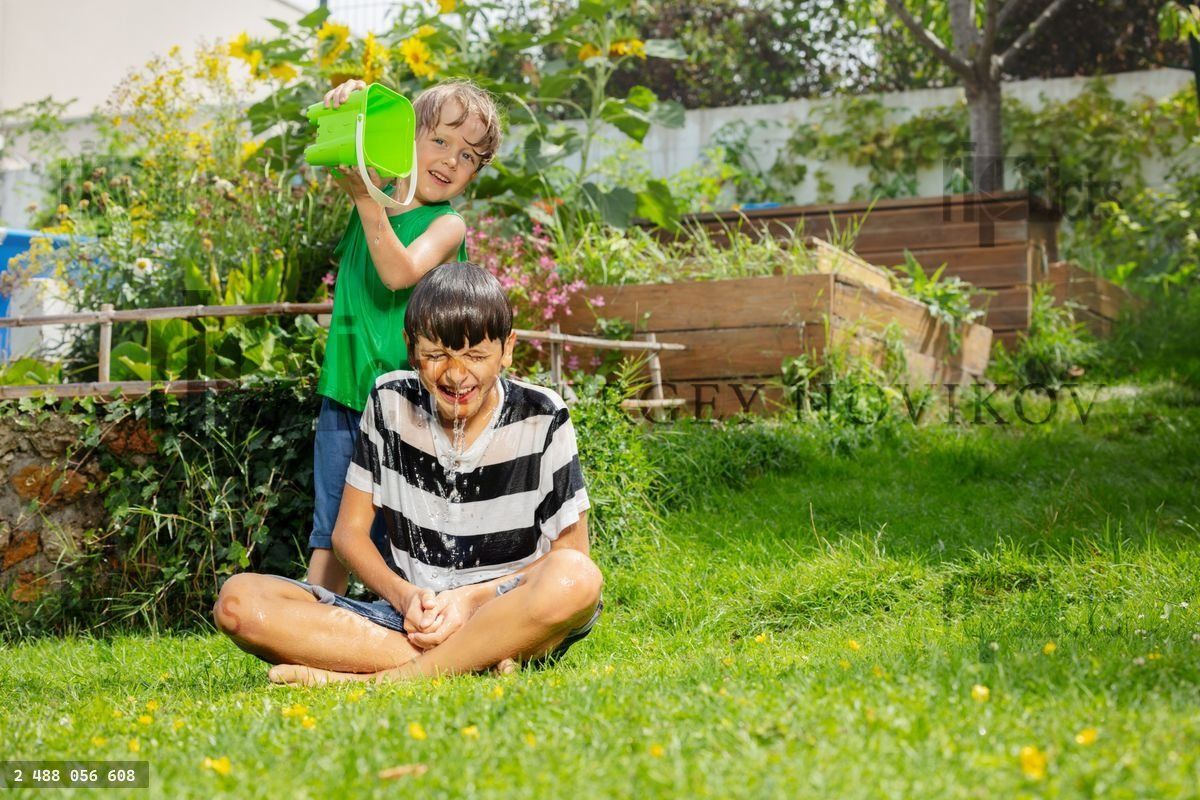 Laughing kid surprises another with a shower from a green bucket in blooming backyard at summer dayLoading purchase options...